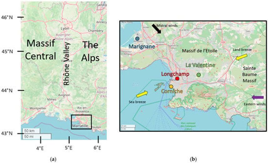 Beyond Marseille–Longchamp, ATMOSUD and its scientific partners operate complementary reference sites covering contrasted environments, including coastal and industrial areas and the Observatoire de Haute-Provence (OHP), a rural high-altitude site representative of background atmospheric conditions.